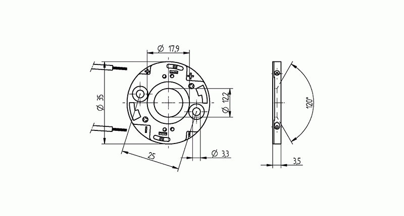 Possui interface para nossos refletores através de encaixe baioneta. A montagem deste conector se dá através de parafusos M3 ou P2F 28.902.-102.10. Máximo torque de fixação 0,5 Nm. A polaridade do LED deve ser observada. As especificações do fabricante do LED devem ser observadas.